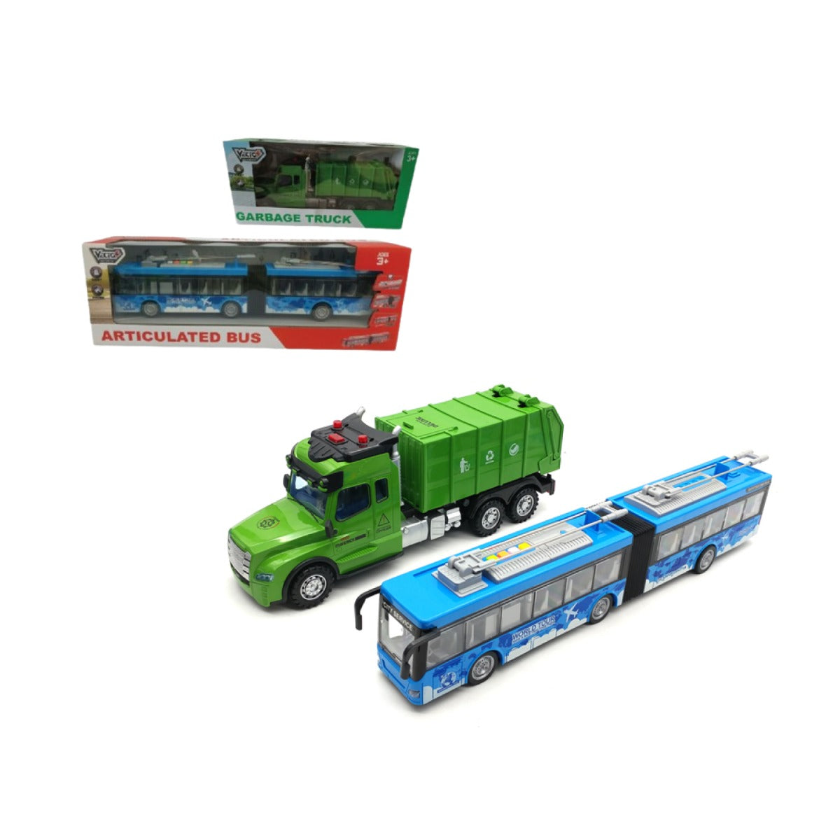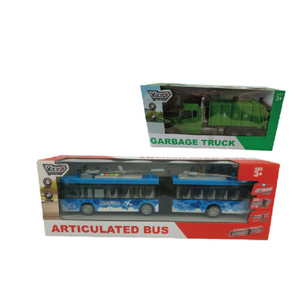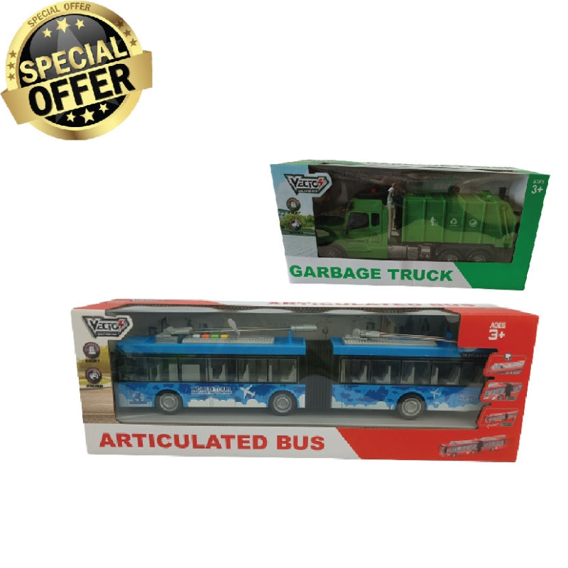 Articulated bus and garbage truck toy set includes: