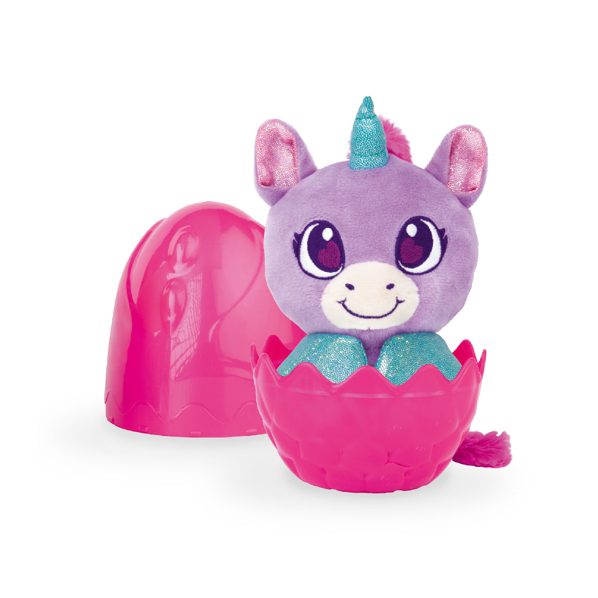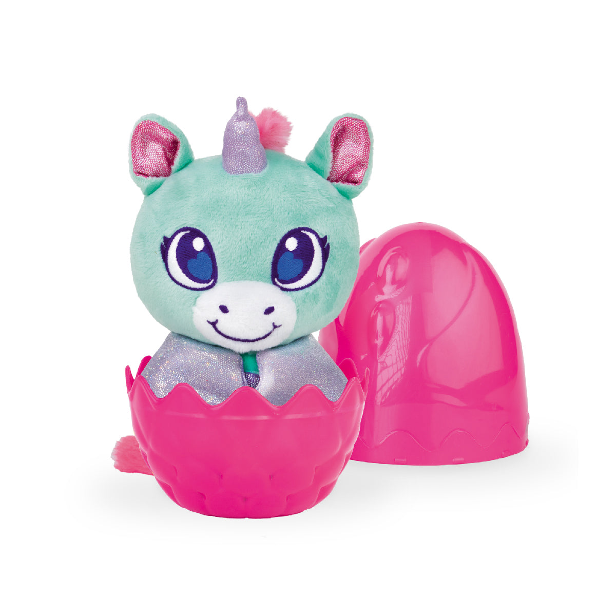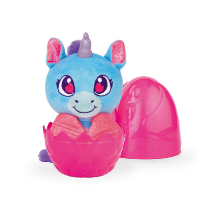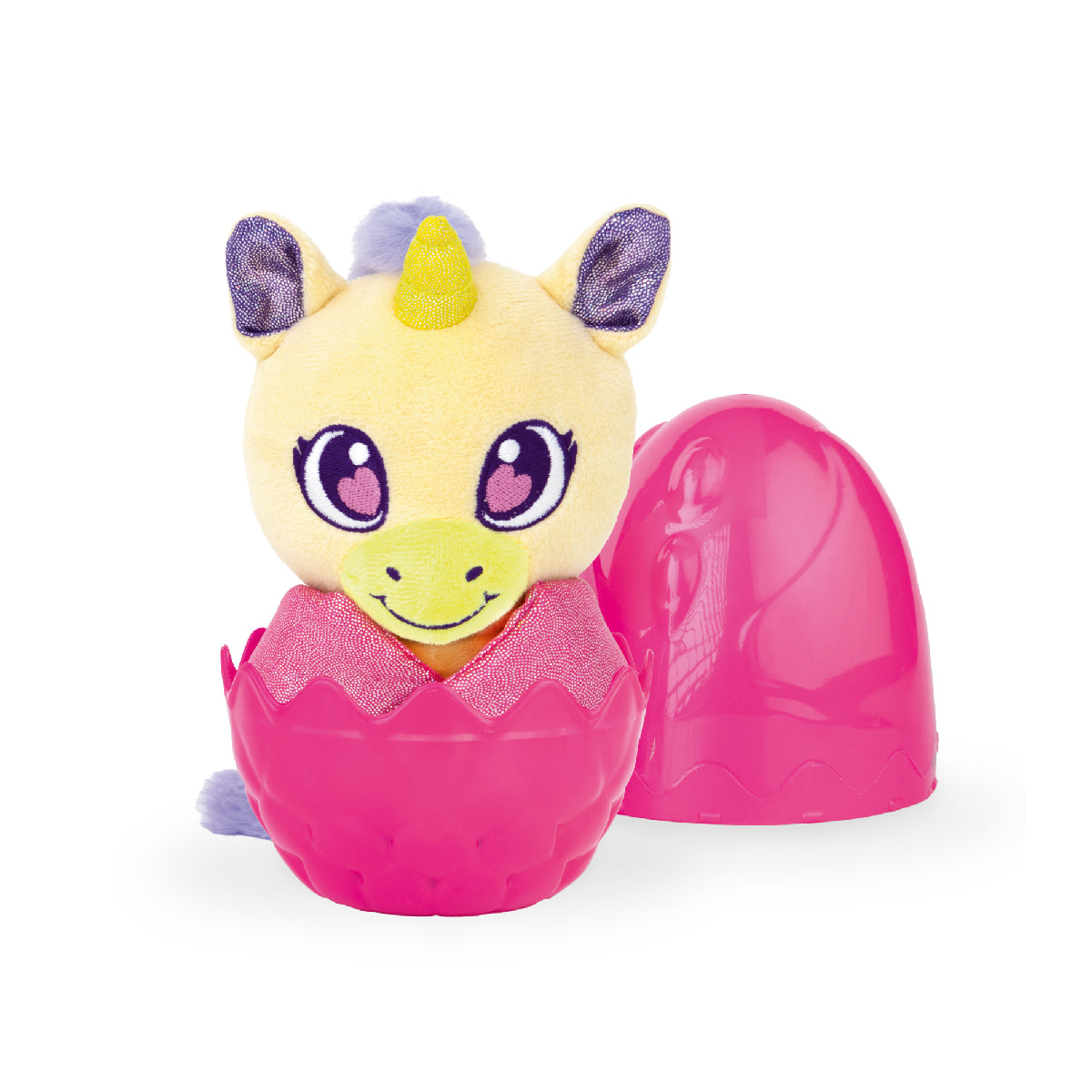 Adorable unicorn-shaped stuffed toy, contained in a novel egg.
