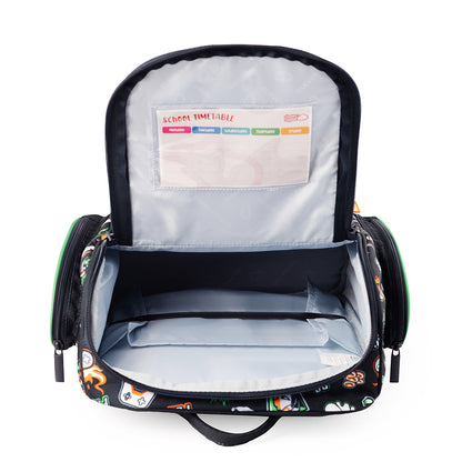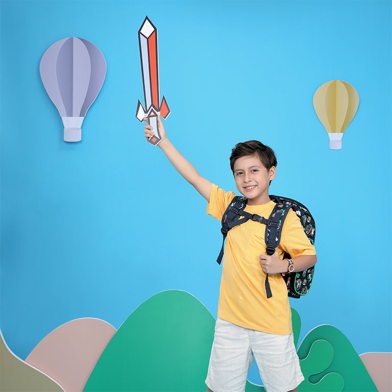 - Ngăn chứa tiện dụng: Ngăn chính có kèm đai thun giúp cố định sách vở, cùng với túi lưới giúp phân bổ, sắp xếp đồ dùng dễ dàng; Ngăn phụ có thể đựng bút viết và đồ dùng học tập; Ngăn chính đựng vừa giấy A4, sách bài tập,...; 2 ngăn hông có khóa kéo tiện dụng, dùng đựng bình nước hay các vật dụng nhỏ xinh của bé.