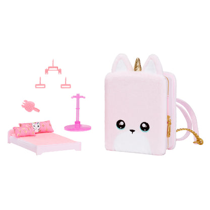 - Bao gồm 1 búp bê vải, 1 ba lô nhựa bọc lông nhung và phụ kiện nội thất đi kèm