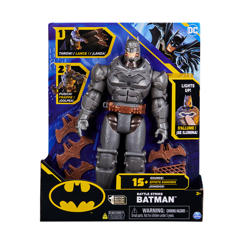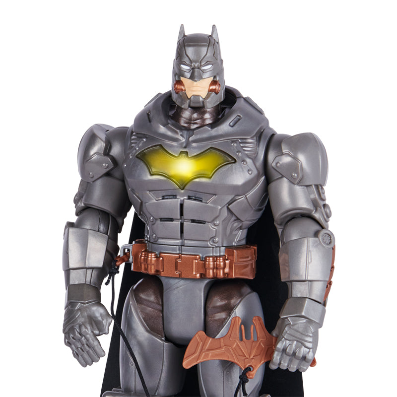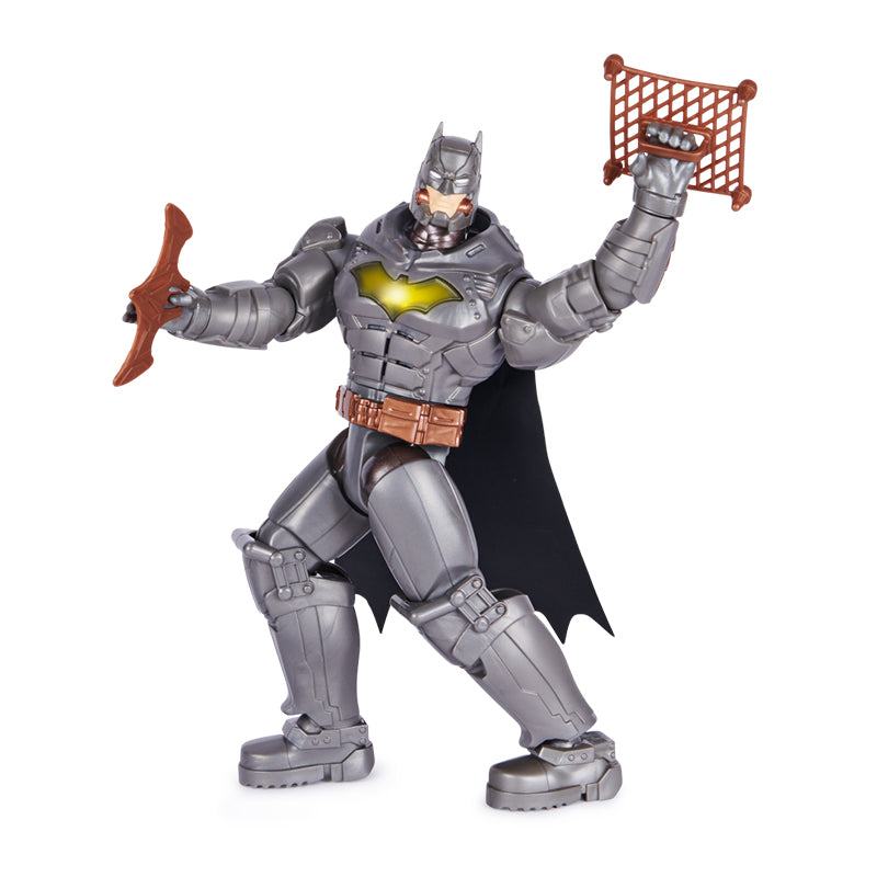 Batman 12 inch giáp robot kèm vũ khí được trang bị giáp vũ trang ánh kim chắc chắn cùng 5 phụ kiện đi kèm gồm 3 boomerang cánh dơi, 1 batarang kèm dây và 1 lưới bắt cướp. Ngực giáp Batman hình cánh dơi có thể phát sáng mỗi khi ấn vào.