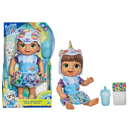 Gặp gỡ Baby Alive Tinycorns Panda: búp bê đáng yêu bước ra từ truyện cổ tích với những cuộc phiêu lưu kì ảo! Hãy dùng trí tưởng tượng để khám phá 1 thế giới mới, cầu trượt cầu vòng đầy màu sắc? hay bầu trời đầy sao? Hoặc là 1 buổi tiệc trà trên mây với các bạn búp bê Tinycorns! Búp bê Tinycorns Panda đáng yêu với mũ mô phỏng Unicorn Panda, gấu trúc kì lân đáng yêu và bình sữa xinh xắn.