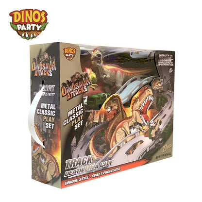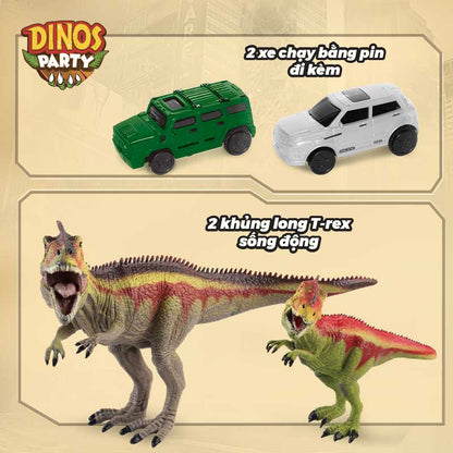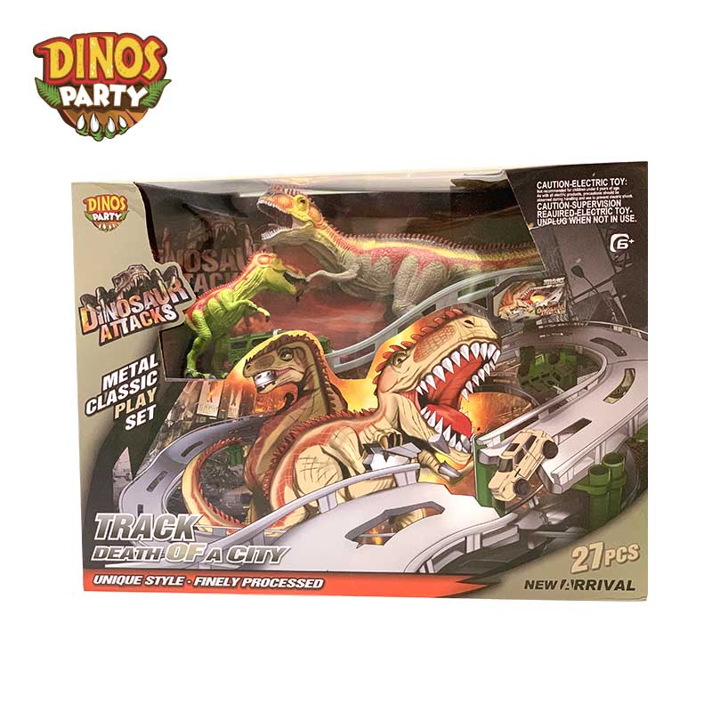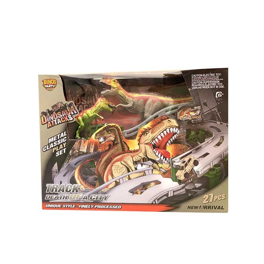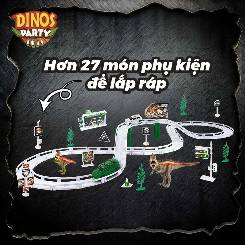 Bộ lắp ráp đường đua thành phố khủng long (xe chạy pin) của thương hiệu DINOS PARTY, bao gồm: