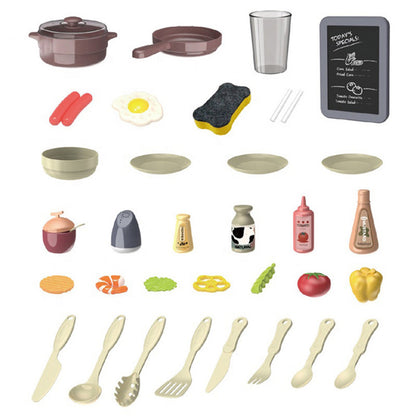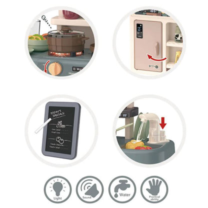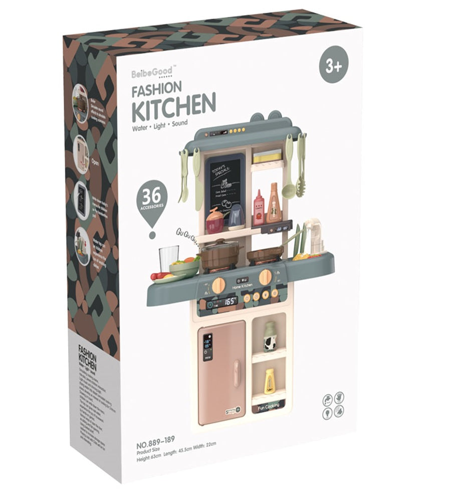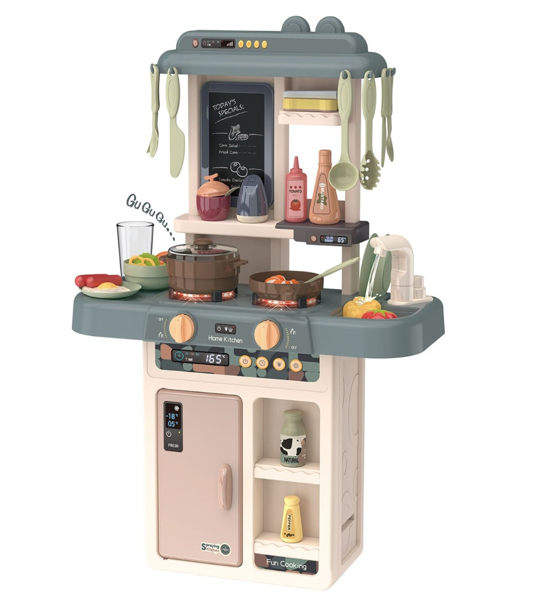 Bộ sản phẩm nhà bếp cho bé với 36 chi tiết. Có đèn, âm thanh và có thể chơi nước nước. Bé sẽ có cơ hội trở thành đầu bếp tài ba nấu nhiều món ăn ngon cho gia đình. Bộ đồ chơi nhà bếp có thể mô phỏng lửa bếp ga, hơi nước bốc lên từ nồi thức ăn, bồn rửa rau củ như thật khi bé có thể rửa trực tiếp với nước, bảng nhỏ để bé ghi lại các công thức nấu ăn của mình