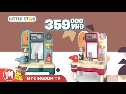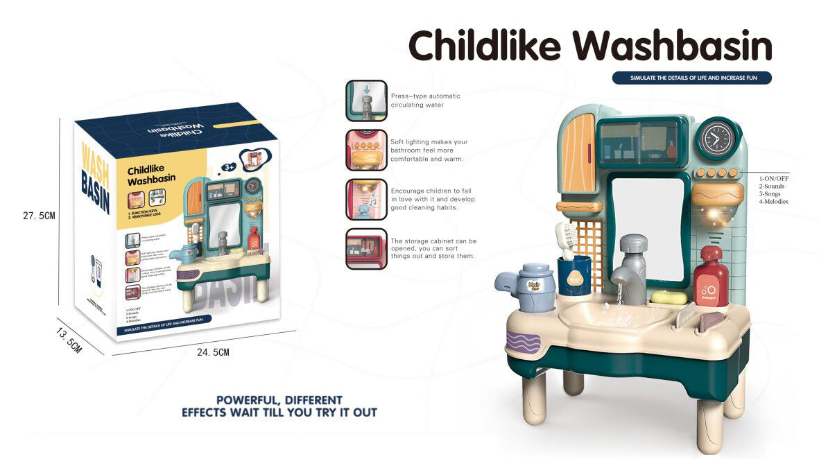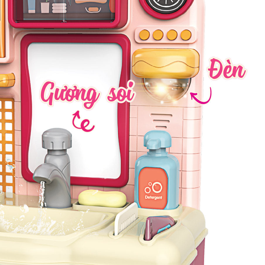 Bồn rửa mặt có thể chơi được với nước, có âm thanh với giai điệu êm dịu cùng ánh đèn vàng nhẹ nhàng, hộc tủ nhỏ xinh cho bé cất giữ đồ dùng cá nhân, khuyến khích bé tập thói quen chăm chỉ vệ sinh cá nhân hằng ngày.