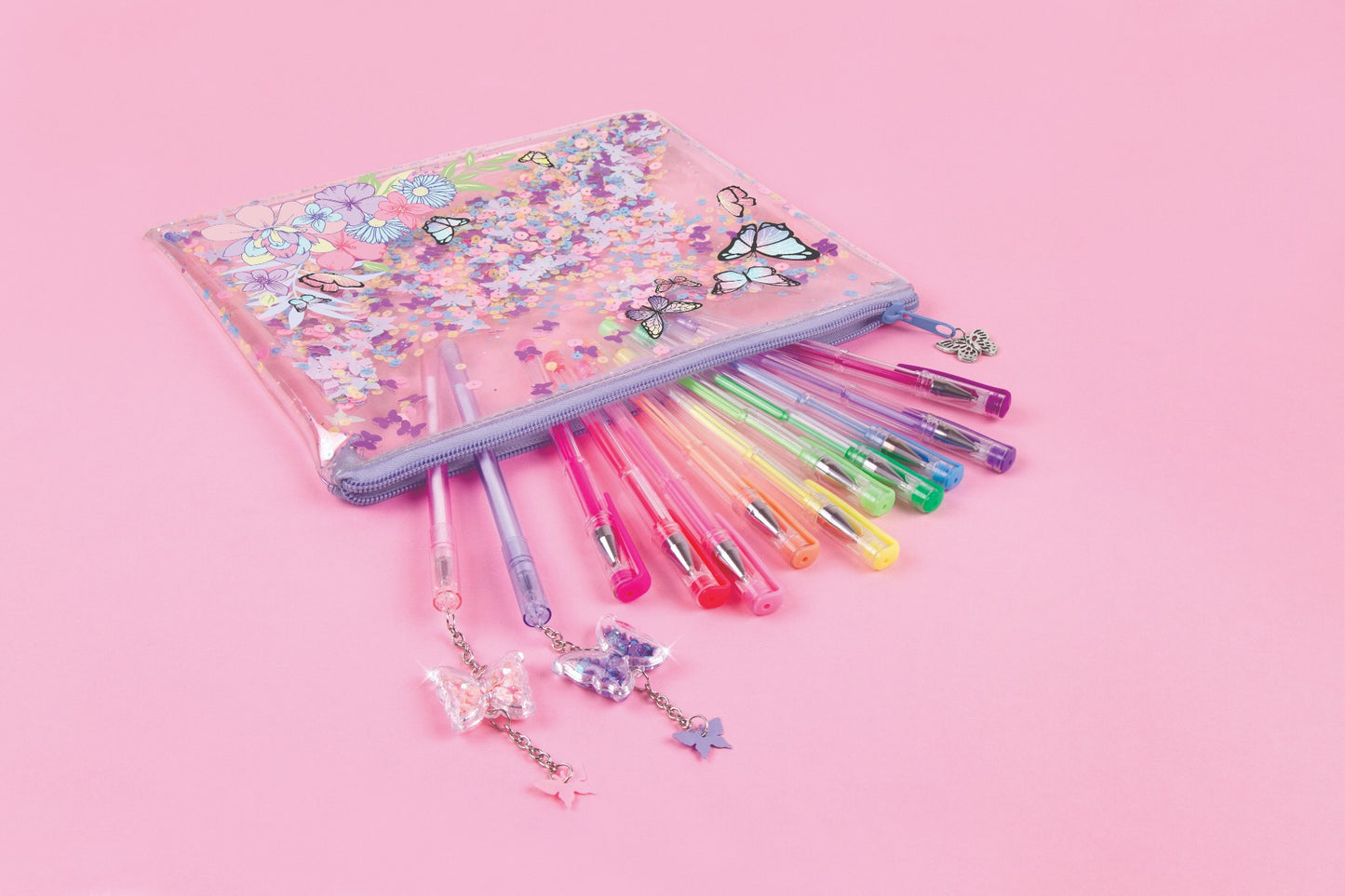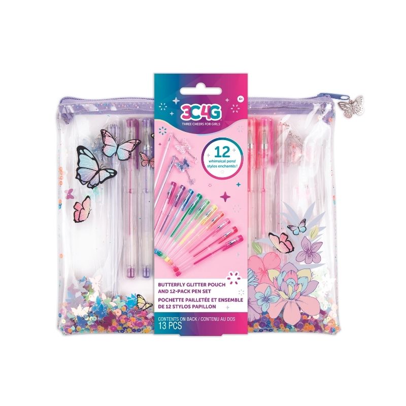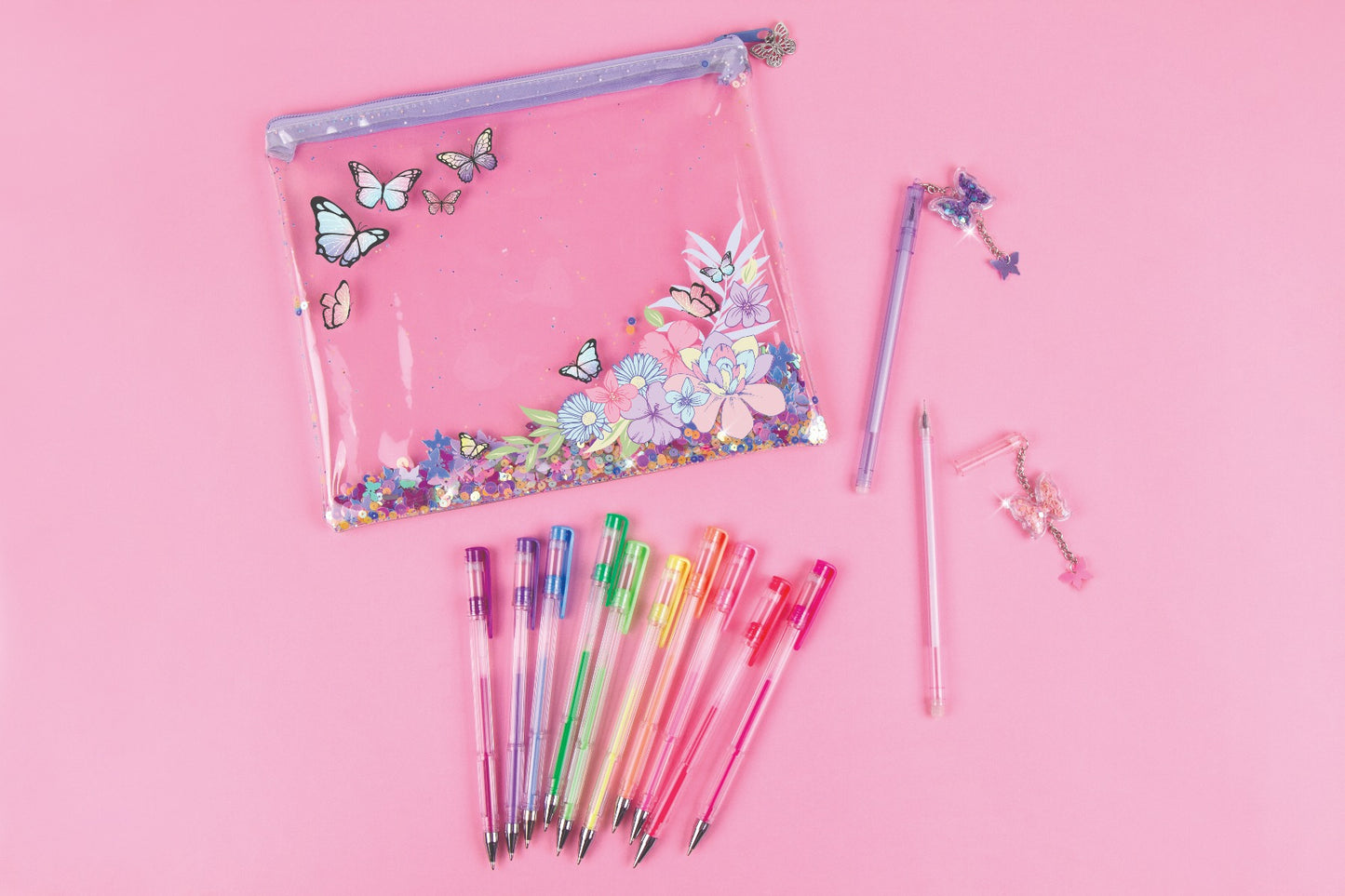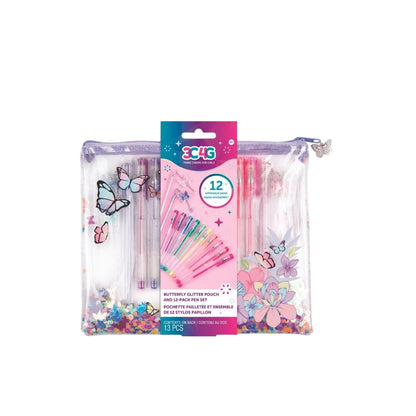 Chiếc túi có khóa kéo màu trong suốt với những họa tiết hoa và bướm xin xắn hứa hẹn là lựa chọn hoàn hảo để mang theo tất cả các loại bút của bé ở mọi lúc mọi nơi. Bên trong túi đựng bút là 10 bút gel và 2 chiếc bút với charm hình bướm đáng yêu. Bé có thể dùng để ghi chú, highlight hay trang trí.