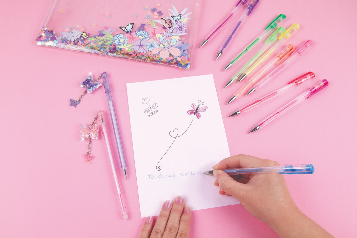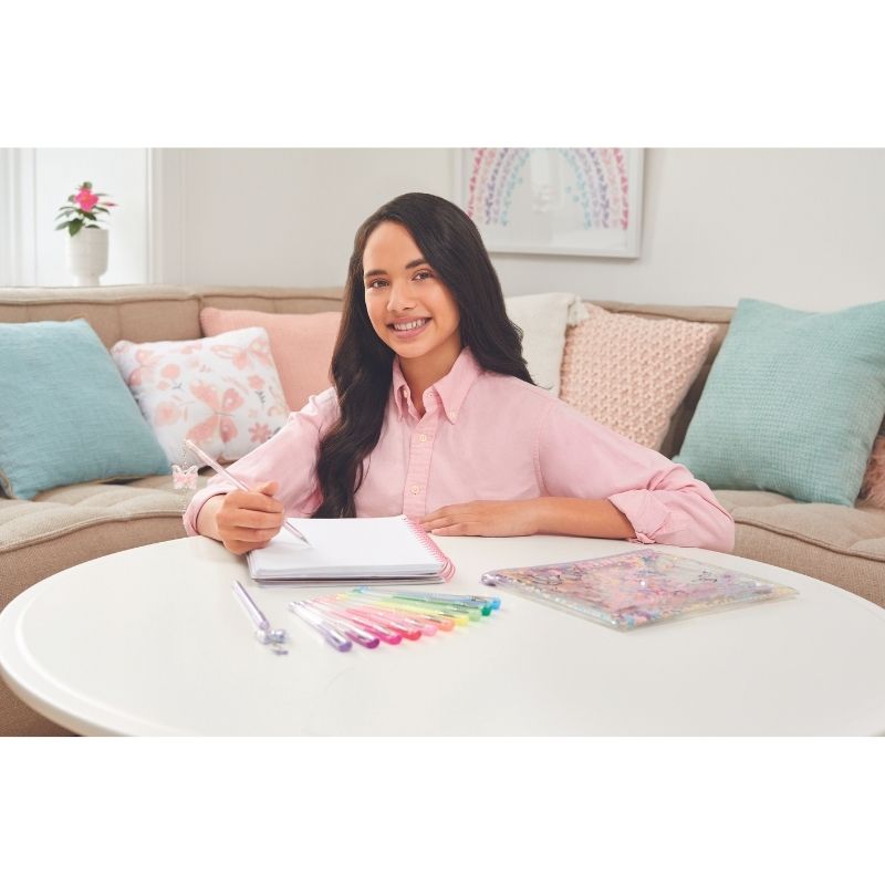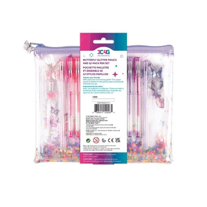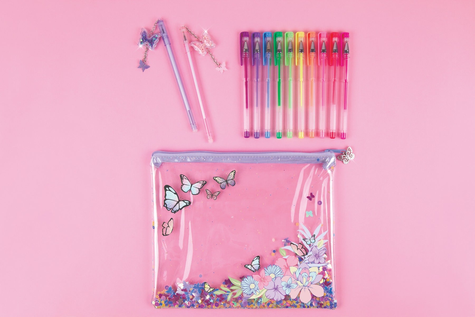 Chiếc túi có khóa kéo màu trong suốt với những họa tiết hoa và bướm xin xắn hứa hẹn là lựa chọn hoàn hảo để mang theo tất cả các loại bút của bé ở mọi lúc mọi nơi. Bên trong túi đựng bút là 10 bút gel và 2 chiếc bút với charm hình bướm đáng yêu. Bé có thể dùng để ghi chú, highlight hay trang trí.