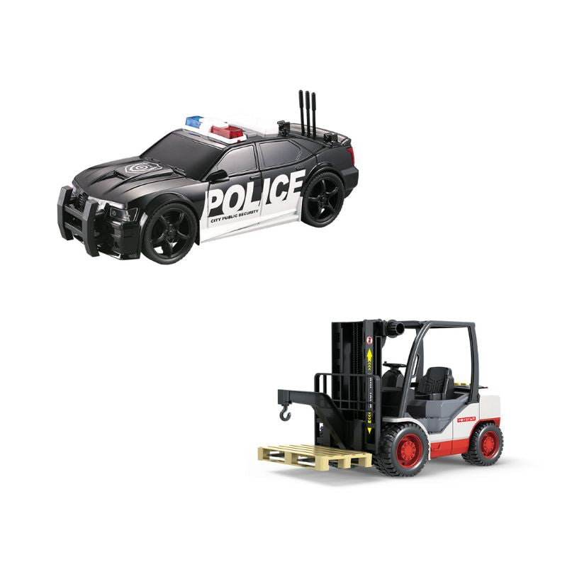Bộ đồ chơi combo xe cảnh sát và xe nâng hàng bao gồm: