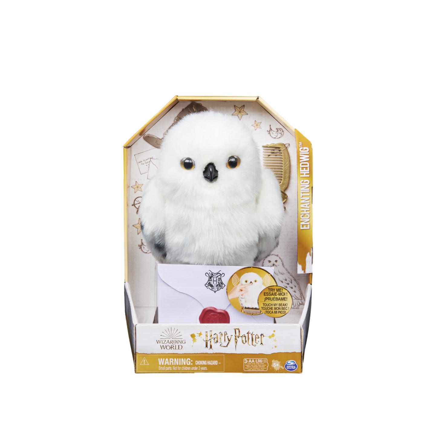 Cú tuyết đưa thư Hedwig là người bạn trung thành bậc nhất bên cạnh cầu chủ Harry Potter. Hedwig luôn có thể tìm ra người nhận thư để giao thư cho Harry. Hedwig là một nàng cú thông minh nhưng cũng rất khó tính. Cô nàng không thích lông mình bị xù lên, vì vậy nếu không muốn bị nàng cú giận hơn, thì khi vuốt ve cô nàng, hãy chú ý vuốt theo chiều lông mọc bạn nhé. Hedwig sẽ được tặng kèm một chiếc lược chải lông xinh xắn để bạn thỏa thích chăm sóc bộ lông cú mềm mượt của cô nàng.