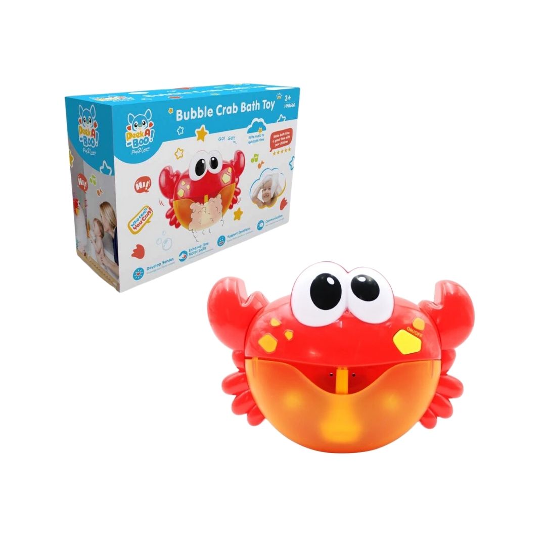 Cua bong bóng của Peek A Boo là một trong những sản phẩm được ưa chuộng nhất. Chỉ với một ít xà bông tắm và nước, chú cua có thể tạo ra vô số bong bóng nước kèm những bài nhạc vui nhộn. Sản phẩm chạy bằng pin, an toàn cho bé, độ chống nước tốt giúp tăng độ bền.