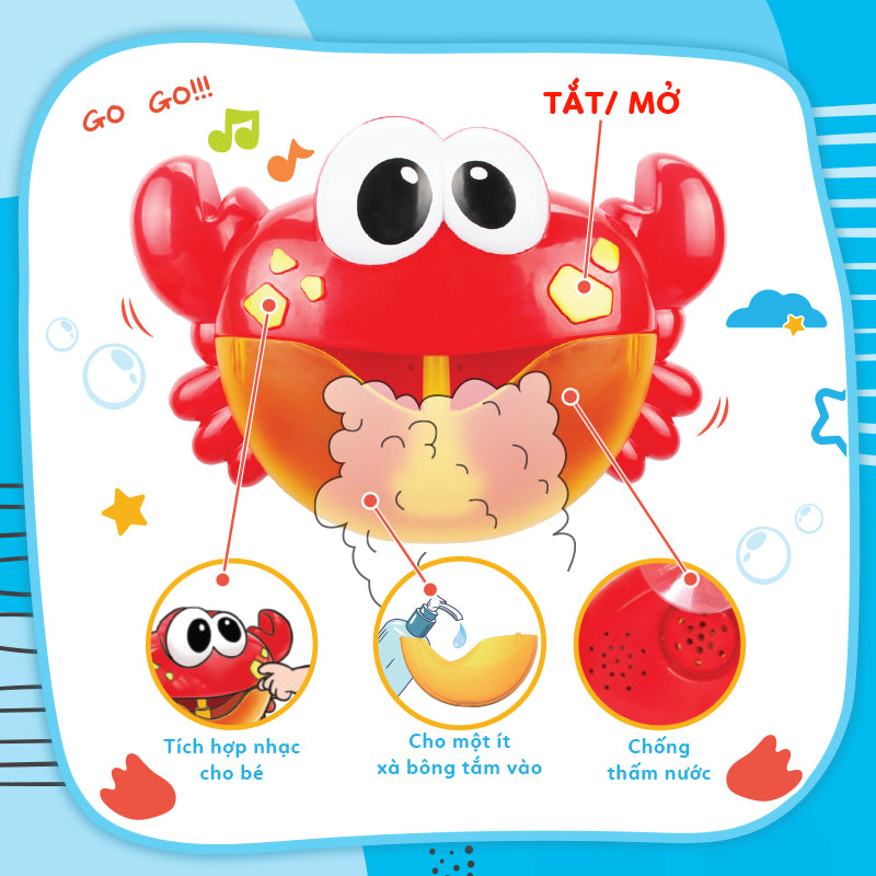 • Chỉ cần bỏ một ít sữa tắm và nước vào hộc đựng, cua sẽ tự động tạo vô số bong bóng cho bé vui đùa thỏa thích