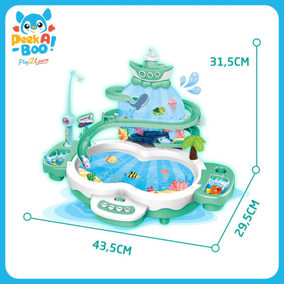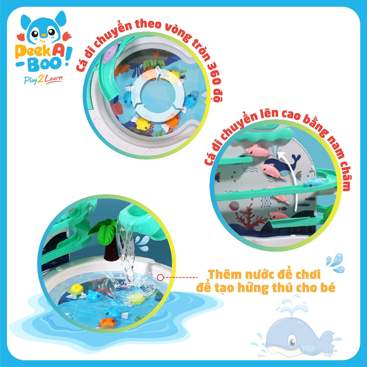 - Câu cá với hồ cá xoay 360 độ, có thể đổ nước vào cho bé chơi, đường rây trượt vui nhộn