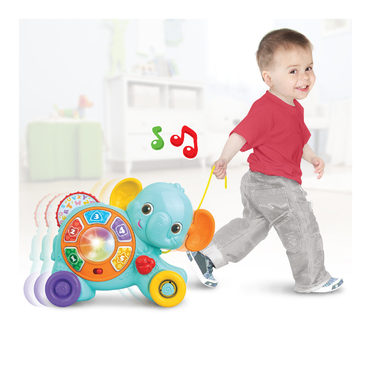 Mang đến cho bé những giờ chơi vui nhộn và bổ ích– chú voi kéo đáng yêu với âm thanh vui nhộn và hiệu ứng ánh sáng thú vị!