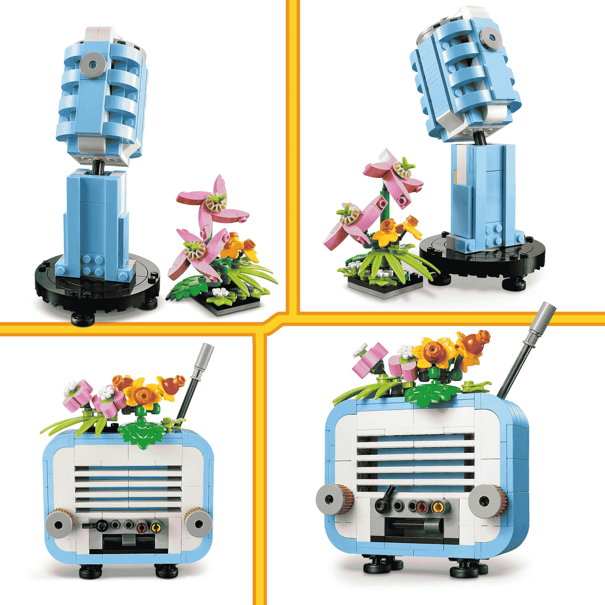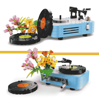 Hãy sẵn sàng tham gia bữa tiệc với 3 bộ nhạc retro khác nhau! Khám phá Máy quay đĩa với Hoa, với đĩa quay chuyển động, cần gạt chuyển động và 2 đĩa nhạc. Lắp ráp lại thành một chiếc radio đồ chơi trang trí hoa với các nút điều khiển chuyển động và ăng-ten có thể điều chỉnh, hoặc tạo ra một chiếc micro xoay cổ điển với hoa. Bạn sẽ lắp ráp gì? Lựa chọn hoàn toàn là của bạn với bộ 3trong1 tuyệt đẹp này.
