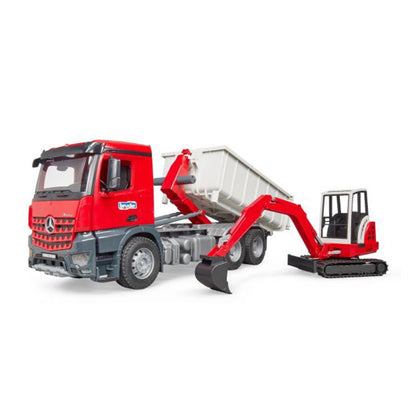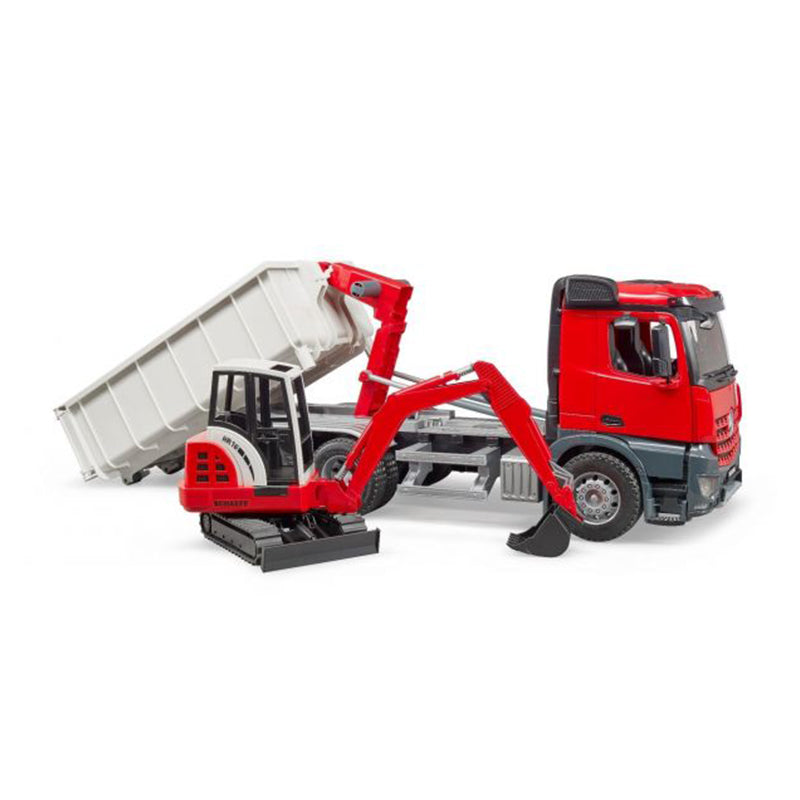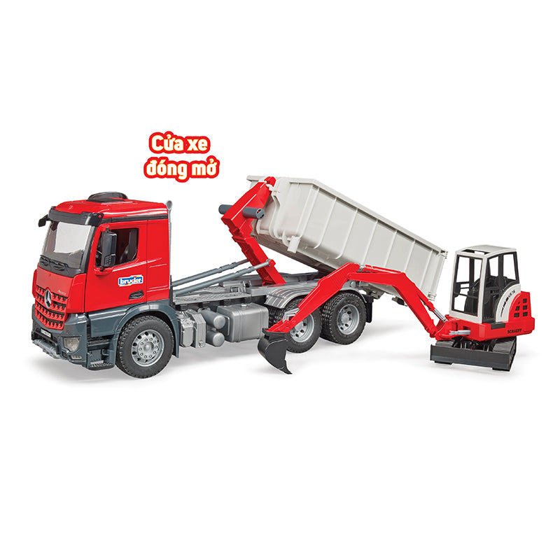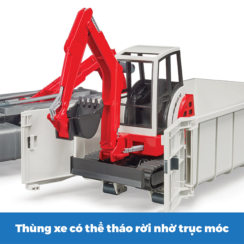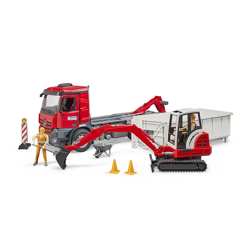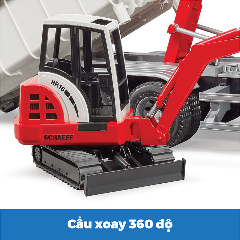 Bộ đồ chơi gồm 2 mô hình xe ben và xe xúc: với các chức năng: cửa sổ cabin làm từ nhựa trong suốt và chống vỡ, gương có thể gập mở, cửa xe có thể mở, container có thể được hạ và thả xuống từ phía sau, container có thể mở cửa và khóa bằng bản lề, lốp cao su,... Khi container đứng trên sàn và cửa mở, các phương tiện BRUDER nhỏ hơn thậm chí có thể lái vào container và sau đó được vận chuyển bằng xe container. Tính năng này được sử dụng rất thường xuyên trong thực tế trên các công trường xây dựng và các nhà xây dựng nhỏ, BRUDER có thể tạo lại những chức năng linh hoạt này khi trẻ em chơi. Máy đào mini Schaeff nổi tiếng được bao gồm trong sự kết hợp tuyệt vời này.