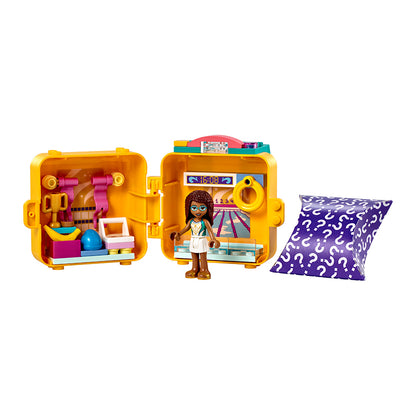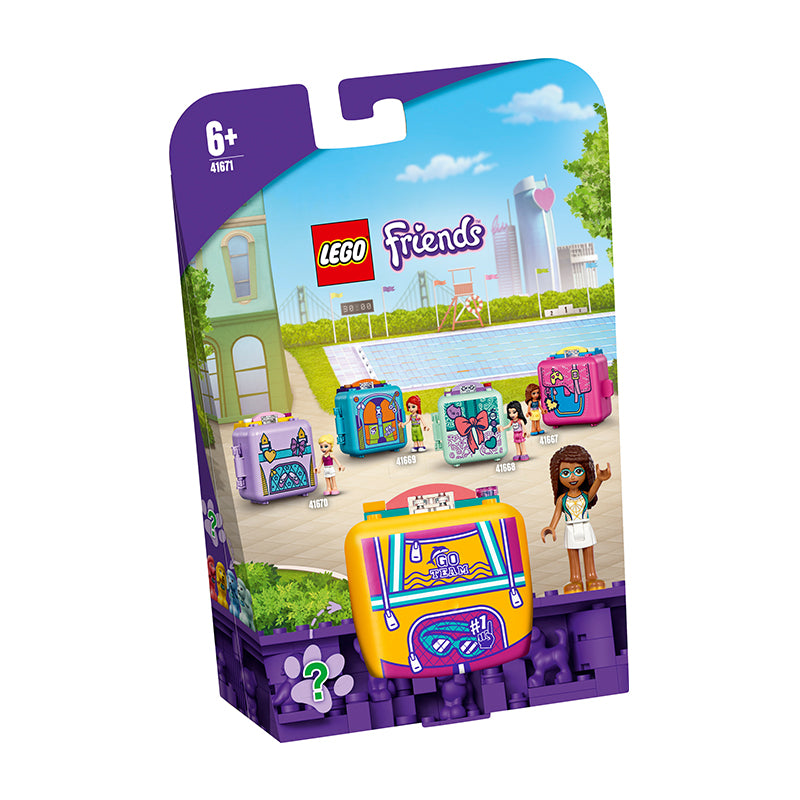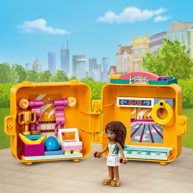 • Khối lập phương bao gồm đồ chơi búp bê mini LEGO® Friends Andrea, đồ chơi chó xù có 1 trong 4 màu sắc khác nhau, một hồ bơi mini có thể xây dựng và ghế, cùng với rất nhiều bộ dụng cụ sáng tạo để giúp khơi gợi trí tưởng tượng.