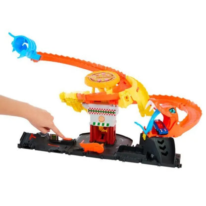 Hãy cùng Bộ đồ chơi Hot Wheels City Cuộc chiến giữa Rắn Hổ Mang và Tiệm Pizza lái xe thẳng vào đuôi rắn và thả xe để xem số phận sẽ đưa xe của bạn vào con đường nào trong ba lối thoát ngẫu nhiên. Liệu xe của bạn sẽ thoát ra qua miệng rắn và rơi vào thùng rác, hay sẽ bị nuốt chửng bởi sinh vật đáng sợ này? Hoặc, bạn có thể đánh bại rắn bằng cách ném một chiếc bánh pizza vào mặt nó!