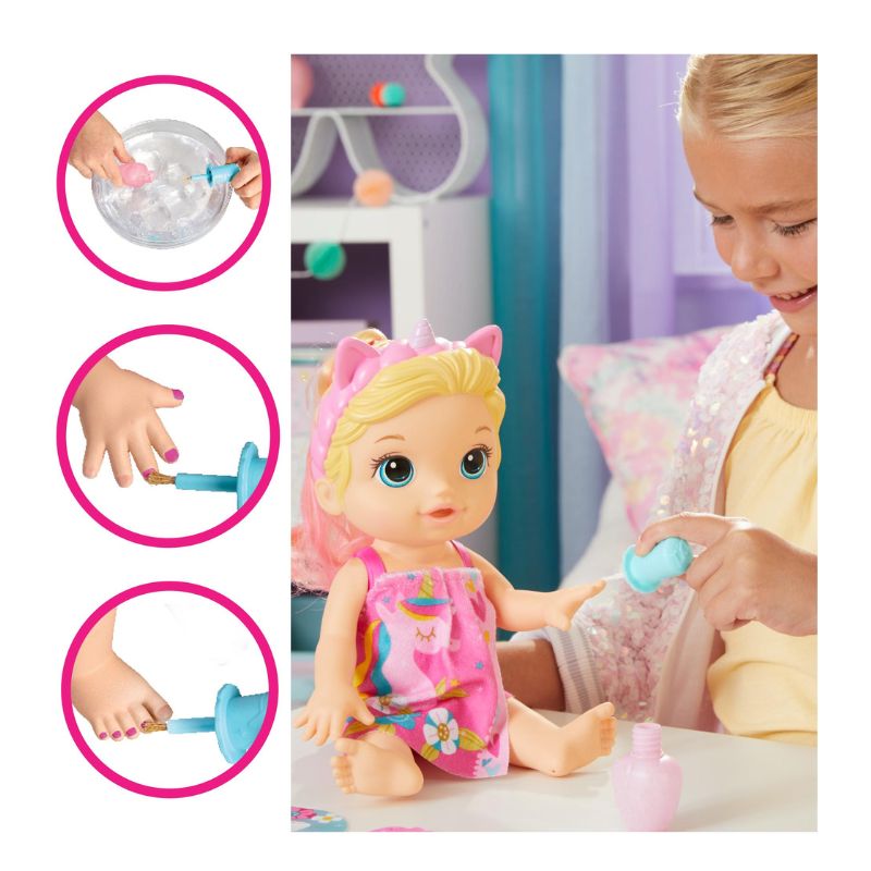 Bé búp bê Zoey thân cứng có kích thước 35 cm, khoác lên mình chiếc áo tắm màu hồng kết hợp với kiểu tóc đuôi ngựa nhuộm hồng xinh xắn. Đi kèm theo búp bê là các phụ kiện spa theo chủ đề kỳ lần, bao gồm khăn quắn, mặt nạ búp bê, lọ sơn móng tay giả và một chiếc lược để bé có thể chải và tạo ra nhiều kiểu tóc. Sau thời gian thư giãn, các bé có thể giúp búp bê bơi trong nước và lau khô người bằng khăn quắn kỳ lân của cô ấy. Bé Zoey là một búp bê trang điểm theo chủ đề vui nhộn dành cho các bé gái và bé trai từ 3 tuổi trở lên.
