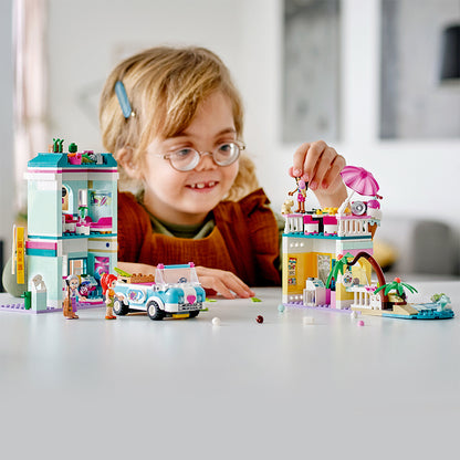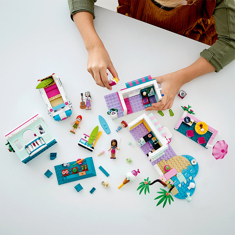 • Bộ đồ chơi bao gồm cửa hàng cho thuê đồ đi biển, cửa hàng kem và căn hộ. Đi kèm với một chiếc ô tô mui trần, LEGO® Friends Mia và Andrea, một con búp bê siêu nhỏ, cùng với đồ chơi chó, cá heo và rùa cho trẻ em.