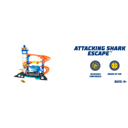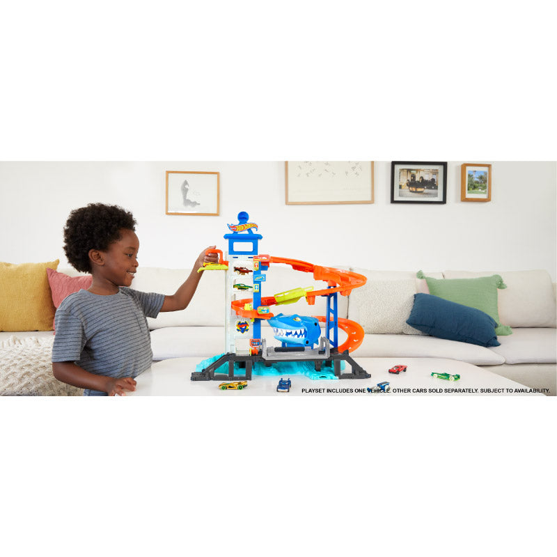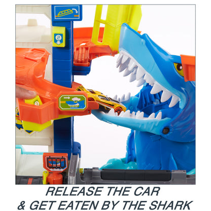Một con cá mập khổng lồ ẩn nấp bên dưới nhà để xe của Thành phố Hot Wheels ™, tấn công và nuốt chửng những phương tiện không nghi ngờ.