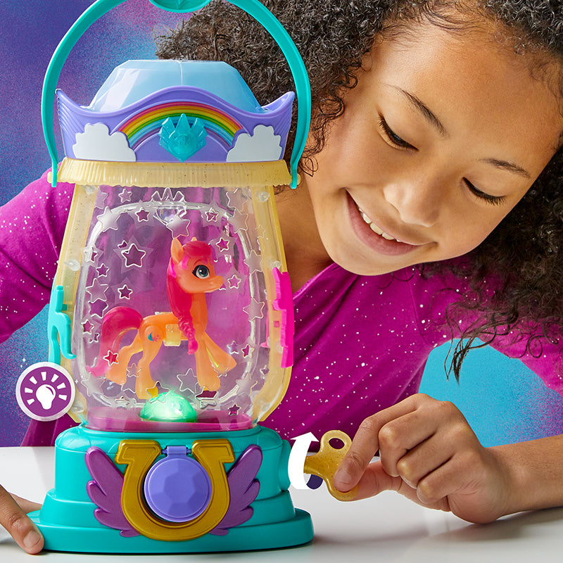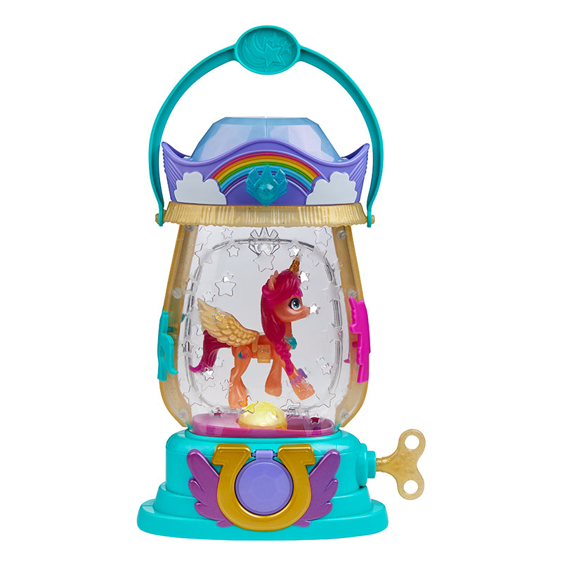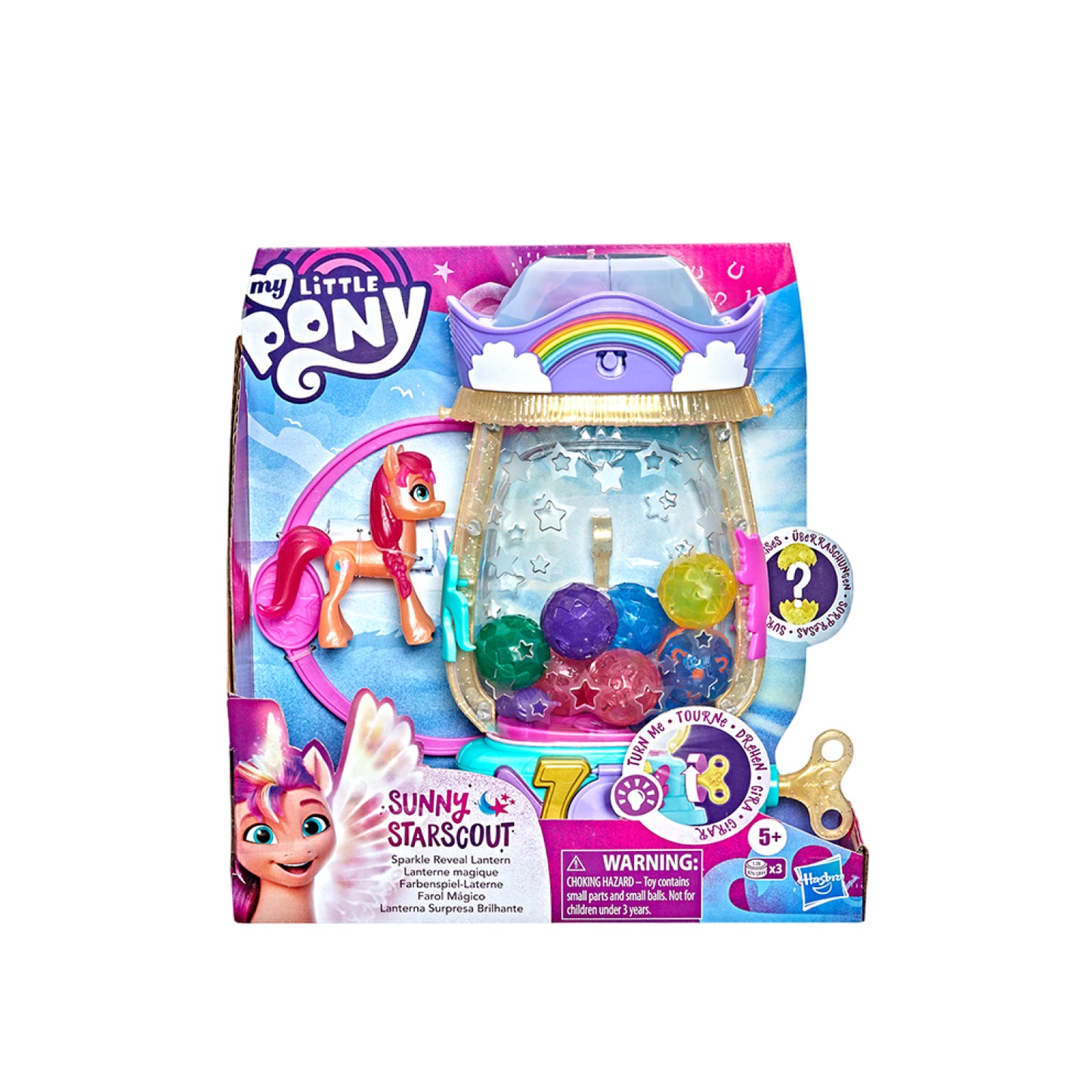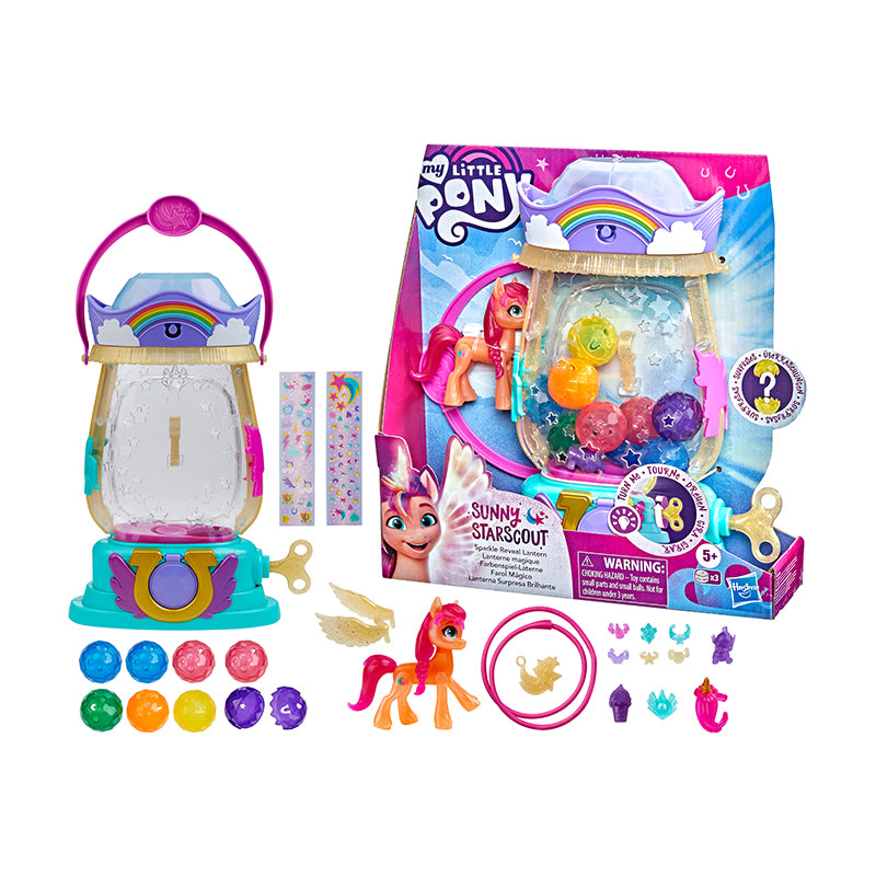 • Chú ngựa con màu cam Sunny Starscout 7.5cm có thể gắn vào mái tóc màu hồng. Hình vẽ và đèn lồng được lấy cảm hứng từ bộ phim My Little Pony: A New Generation.