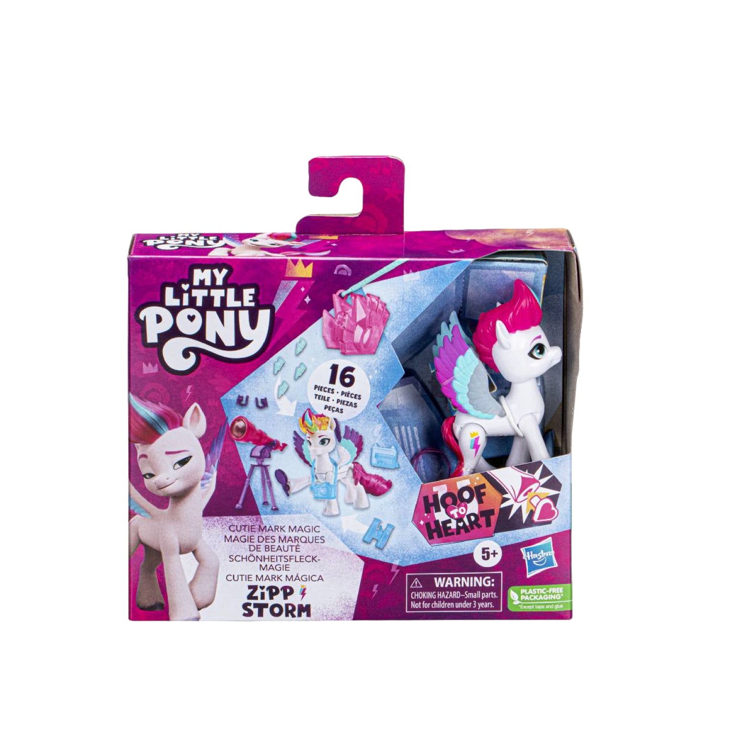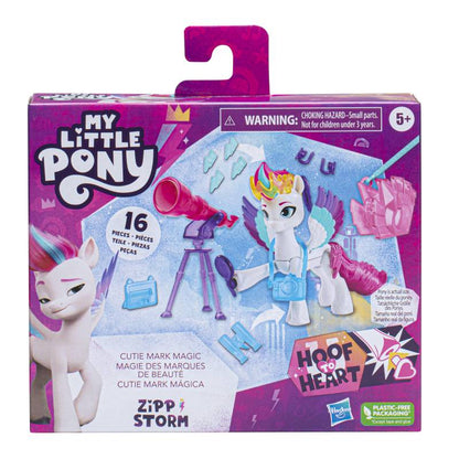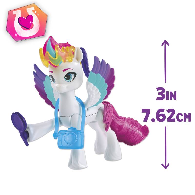 • CUTIE MARK MAGIC WITH ZIPP: Chú kỳ lân Zipp 3 inch màu trắng với lông hồng, lấy cảm hứng từ chương trình My Little Pony: Make Your Mark. Đi kèm với đầu cắm tia chớp Cutie Mark charm và phụ kiện tóc!