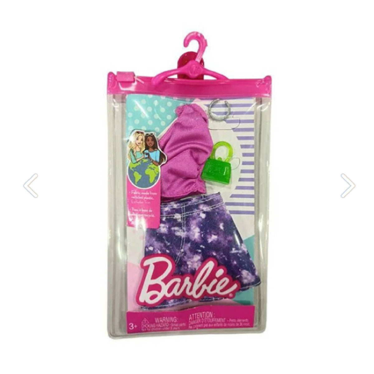 Barbie yêu thích bộ Trang phục hợp thời trang mang những hình ảnh của biển. Với chiếc áo croptop màu hồng và chiếc quần skirt màu tím với hình ảnh của đại dương bao la. Đi kèm 1 túi xách xánh lá và 1 chiếc lược cài bạc.