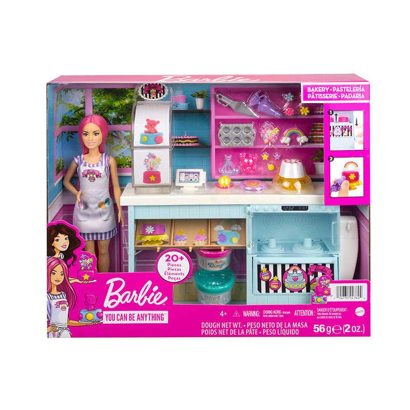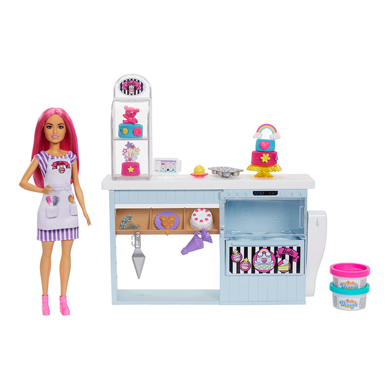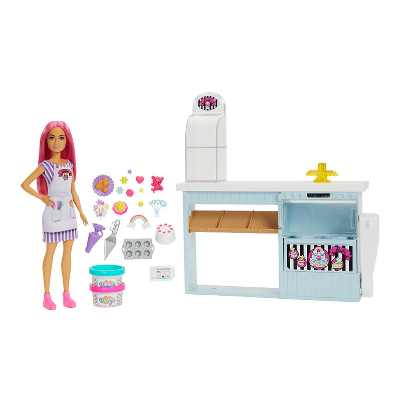Khám phá một thế giới cửa hàng bánh và trang trí bánh với Barbie Bakery Playset! Với hình dáng nhỏ nhắn, mái tóc hồng, mặc một chiếc váy sọc dễ thương với áo khoác, búp bê Barbie® đã sẵn sàng làm ra chiếc bánh thật đẹp mắt.