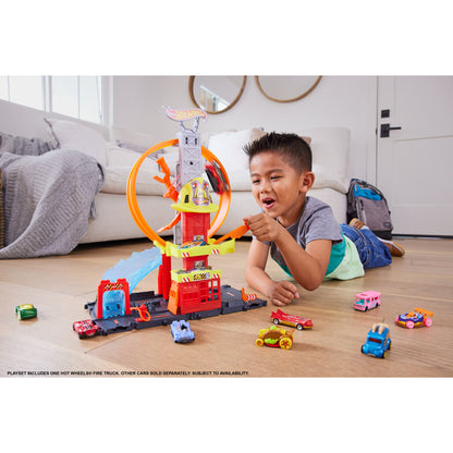 Đóng thế và chạy đua qua một vòng lặp có thể điều chỉnh để cứu Thành phố Hot Wheels™ với bộ trò chơi Super Loop Fire Station!