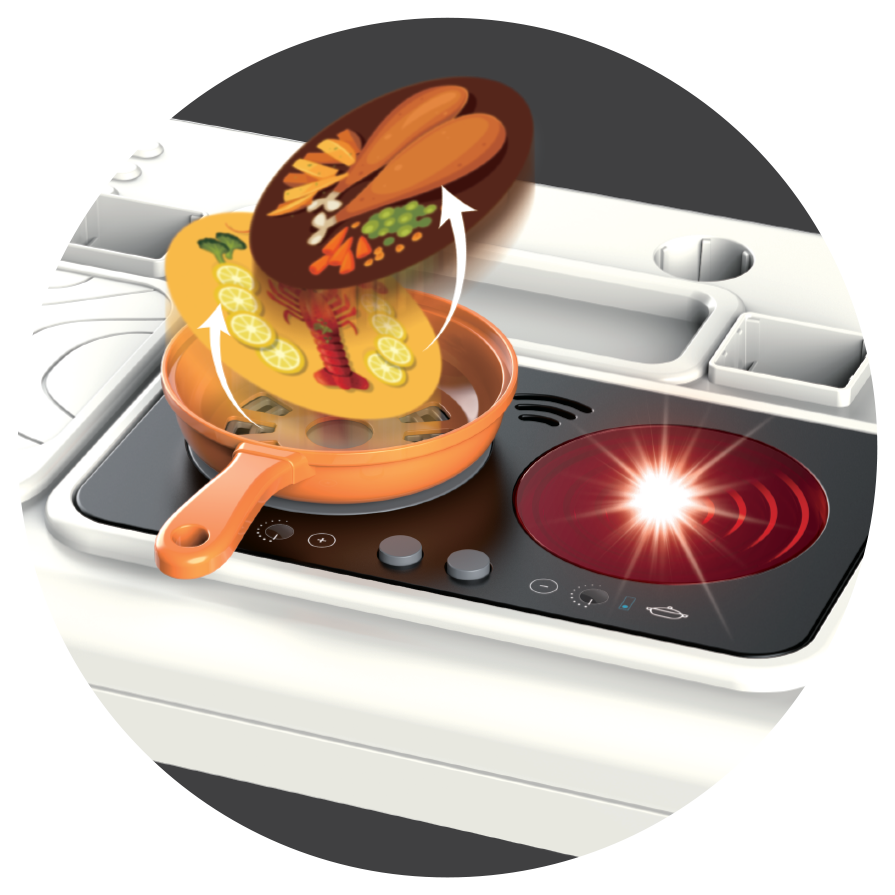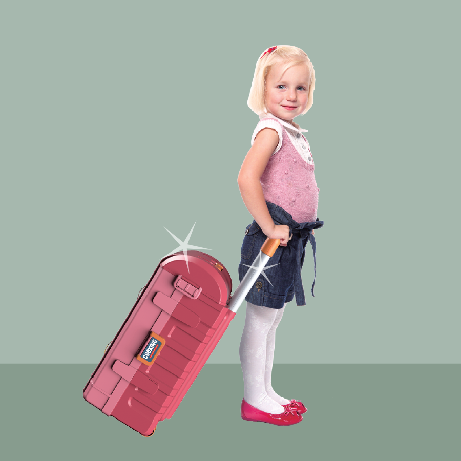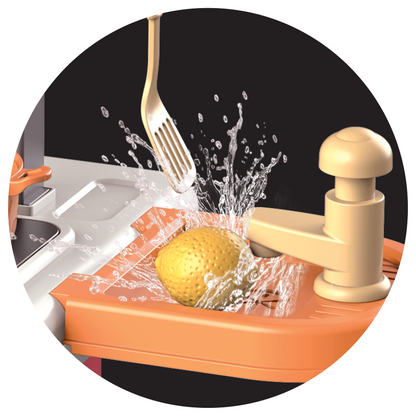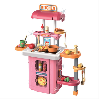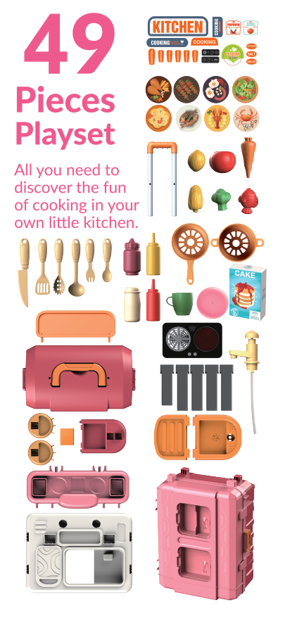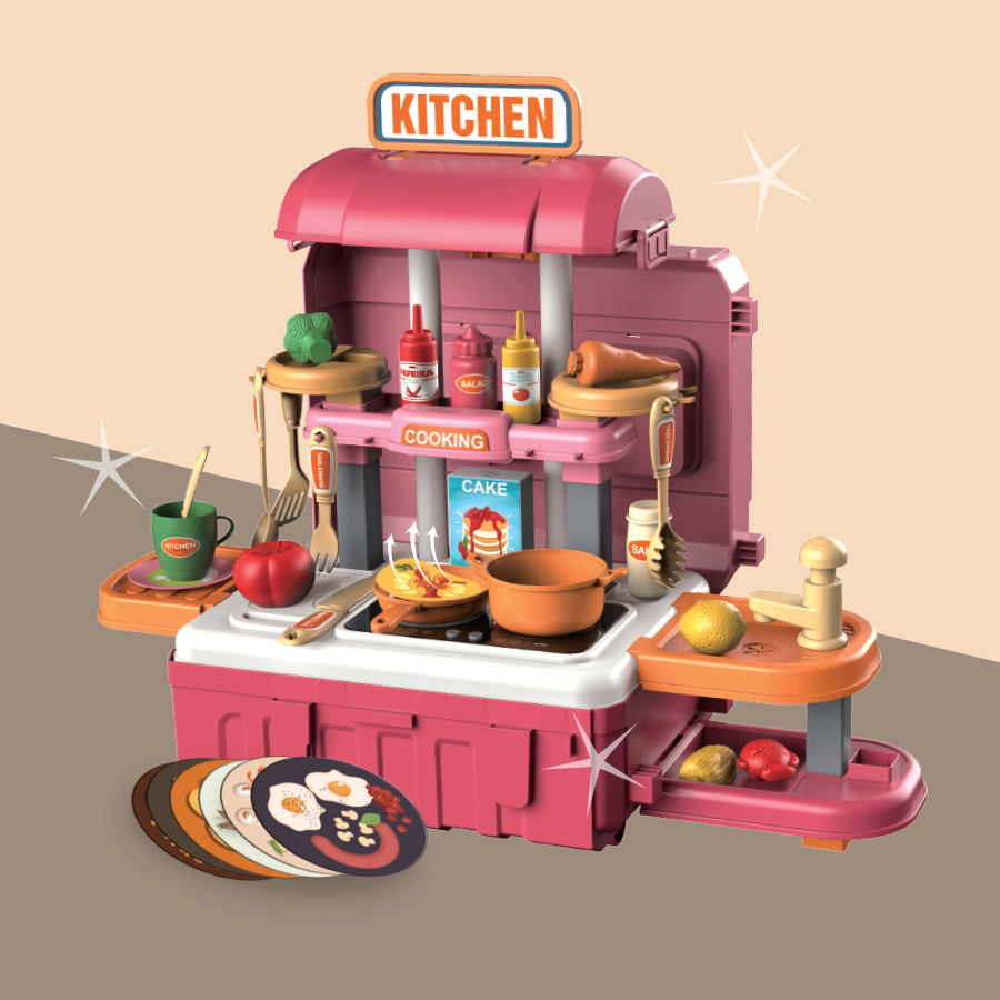 Bộ sản phẩm vali bếp mini xịn xò tích hợp 3 kiểu dáng bếp trong 1: Dáng vali kéo, dáng bếp đứng hoành tráng, và dáng bếp thấp nhỏ xinh. Sản phẩm bao gồm 49 chi tiết và phụ kiện làm bếp đi kèm. Ngoài ra, bếp còn có bồn rửa chơi được với nước thật và chức năng xoay thức ăn, mô phỏng công việc làm bếp như thật cùng đèn và âm thanh sinh động