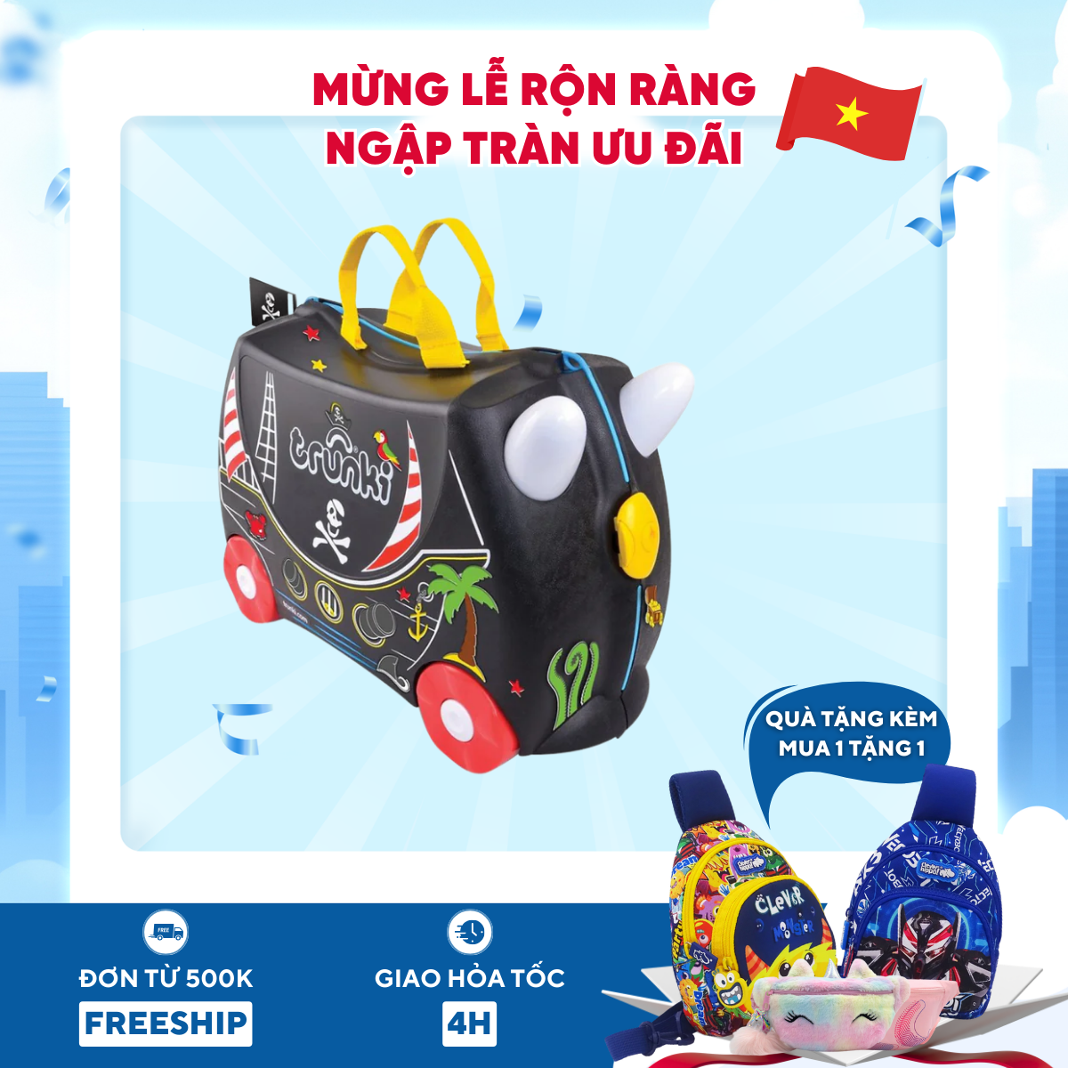 Vali đẩy chân trẻ em Trunki, đến từ Vương Quốc Anh. Là thương hiệu đầu tiên phát minh và sản xuất dòng vali đẩy chân cho bé. Thiết kế hình tàu cướp biển rất được các bé trai yêu thích.