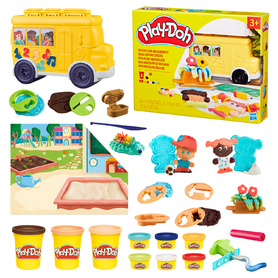Xe buýt Playdoh vui học phù hợp với trẻ từ 3 tuổi trở lên. Bộ đồ chơi gồm 1 mặt thảm có 2 khung cảnh khác nhau: cảnh sân trường và cảnh lớp học, giúp bé có thể tự sáng tạo câu chuyện cho nhân vật của mình.