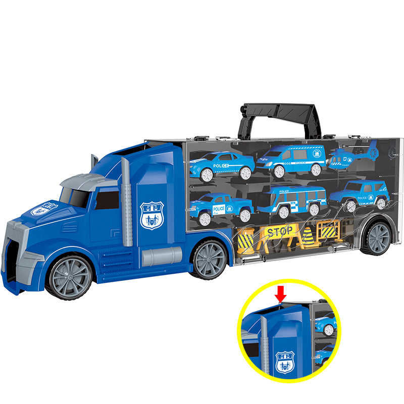 Xe tải nhiều ngăn chủ đề Cảnh sát bao gồm 5 xe cảnh sát và 1 trực thăng, 4 chi tiết trang trí giao thông Bé còn có thể thả các xe con vào đường phóng được tích hợp trên đầu xe tải lớn để tăng cường tốc độ cho các xe con nữa đó. Bộ đồ chơi hứa hẹn sẽ là một món đồ không thể thiếu trong bộ sưu tập xe của các bé trai yêu thích xe mô hình.